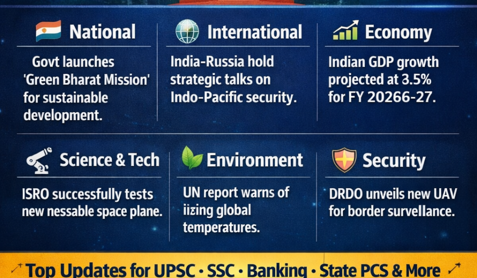 Explore the latest current affairs of 2026 with daily updates covering important developments from India and across the world. This section provides concise and reliable news on national events, international relations, economy, environment, science and technology, security, and government schemes. Carefully curated for UPSC, SSC, Banking, State PCS, and other competitive exam aspirants, these updates highlight key facts, policy changes, reports, and global developments that are frequently asked in exams. Each topic is explained in a clear and easy-to-understand format, helping readers quickly grasp the significance and exam relevance. From major government initiatives and economic reforms to environmental issues and international agreements, our current affairs coverage ensures you stay informed and exam-ready with accurate, timely, and structured information every day.